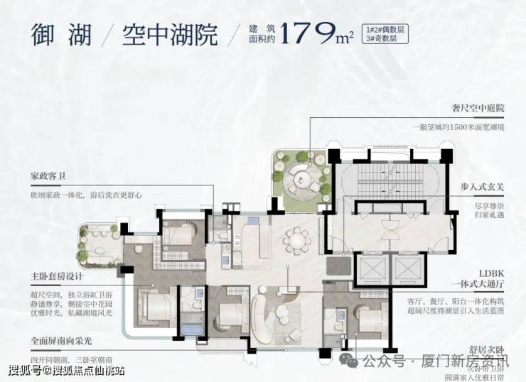 望湖建面约179㎡户型,约30平双露台打造“空中湖院”,还带约10平的独立电梯厅,空间使用率高达近100%,层高约3.15米,约70m家庭欢聚空间,套内可比肩220m大平层。全屋6开间朝南,北向又几乎是全明露台和开窗,高区推窗尽揽约1500米宽阔湖面。