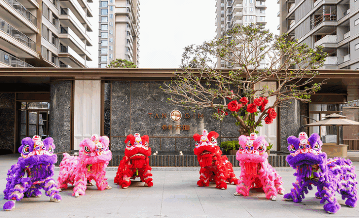 从社区门庭,到交付区,再到每一户的入户门,布满鲜花、红灯笼、礼盒与红毯。