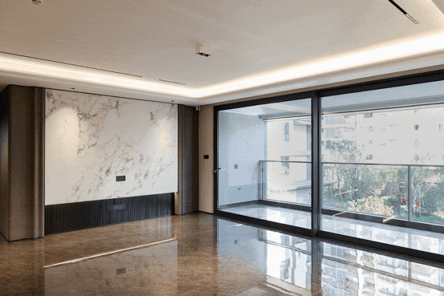 比如,大面积定制岩板无缝拼接客厅背景墙,地面是连纹通铺的高级瓷砖,整体感极强,显得特别大气。