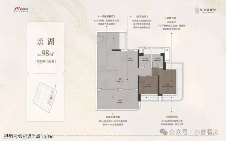 在售户型涵盖 四居室户型,98㎡四房单价与两居室相近,采用全南向设计,部分带有 270° 全景飘窗;