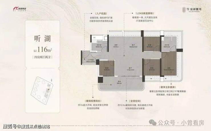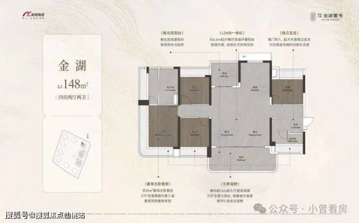 148-149㎡四房单价约 3.6 万 - 4 万元 /㎡,配备 LDKG 一体化设计,南向采光面可达约 16 米,部分房间能直接看到湖景,空间利用率较高。