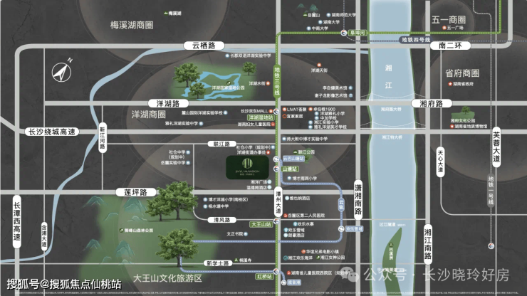 直线距离约850米直达湘江沿江风光带,近邻约6000亩洋湖国家湿地公园、约1200亩巴溪洲公园、约3800亩大王山森林公园、约7100亩伏龙山、约2000亩狮峰山,城市与自然随心切换。