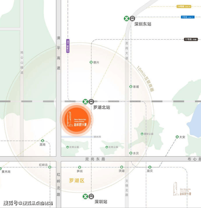 罗湖新材料大厦位于清水河数字新城核心位置,靠近罗湖北交通枢纽,周边4条地铁线环绕。其中,距离集地铁14号线(建成)、17号线(在建)、25号线(一期在建)于一体的罗湖北站直线距离仅100米,距3号线草埔站约900米。目前,深汕铁路罗湖北站高铁站正在紧锣密鼓建设中。