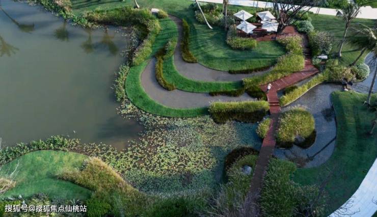 峡谷西侧7期作为最欢乐热闹的溪谷公共活动区,由庆典草坪、金色池塘、雨林商业街、亲子戏水区组成。金色池塘借助自然的高差错落,塑造了一处野趣梯田池塘,日闻蝉鸣,夜听蛙声。彼岸是雨林风情商业街,美轮美奂的夕阳观赏点,阳光照在池塘上,泛起粼粼金光。
