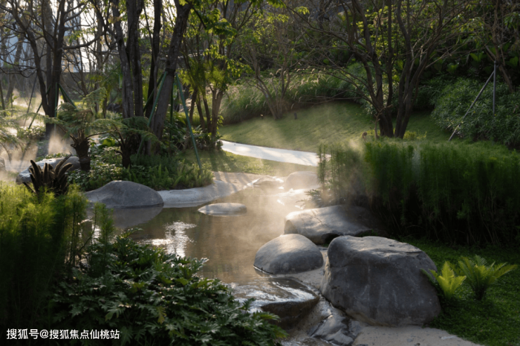 狭长的雨林戏水区融合生态、亲子、戏水等功能,呈现出浓郁的丛林感溪谷玩乐空间。儿童戏水的溪谷沿岸是自然置石,岸边散铺鹅卵石,池底嵌入自然片石,以最自然的方式处理了高差,也给孩子们带来最本真的欢乐。