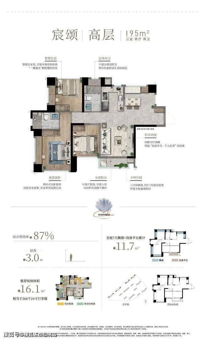 95㎡新规光幕边套:高层边套户型,综合使用率达87%,层高约3米,功能布局可满足多元家庭结构需求。