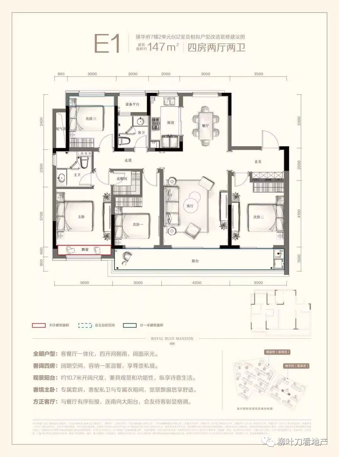 以臻蓝府建面约147㎡的央景洋房为例,这个户型的空间尺度,完全可以媲美早几年的一些建面约170㎡、180㎡高层产品,全明大四房,有一个阔绰的尺度感,无论是一家四口还是三代同堂,都能够轻松驾驭。