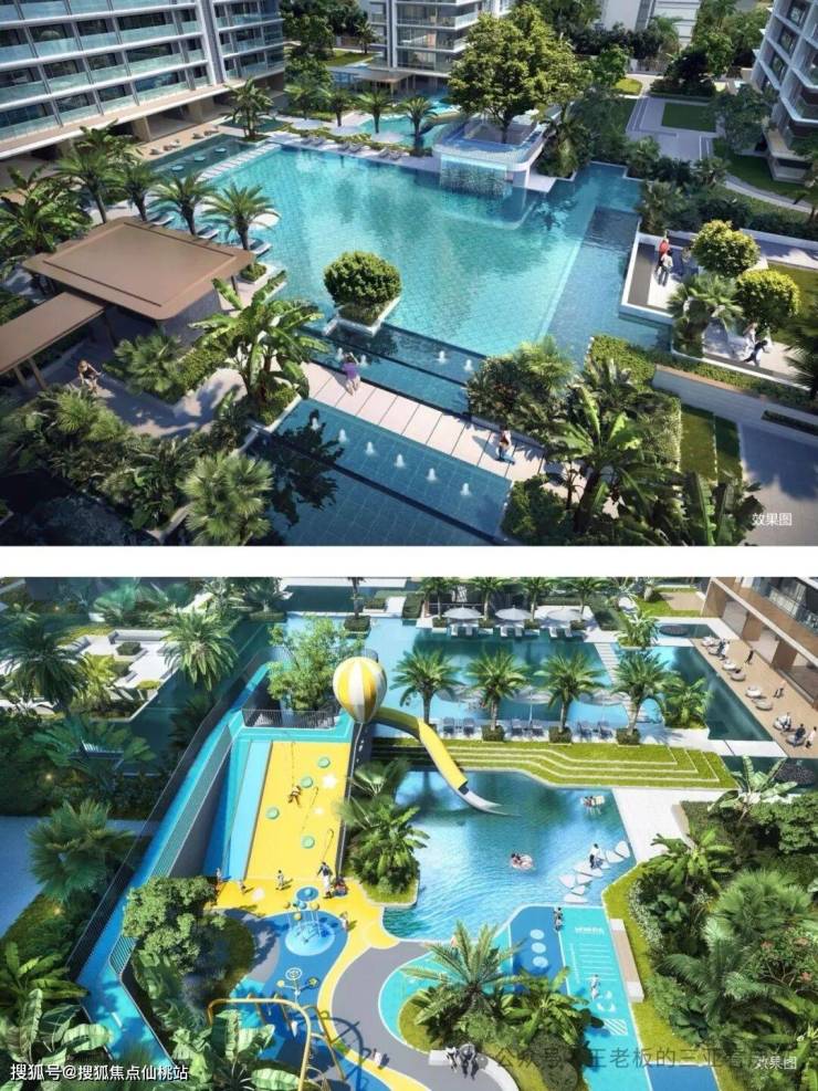 汲取曼谷四季酒店灵感,无边际泳池将奢华建筑与野奢景致自然相融,分区打造立体儿童泳池,特有的叠水景观、水上滑道、攀岩爬道等多元游乐设施,结合城市会客厅、亲水平台和水上汀步等多重景观,营造野奢型国际化度假体验。