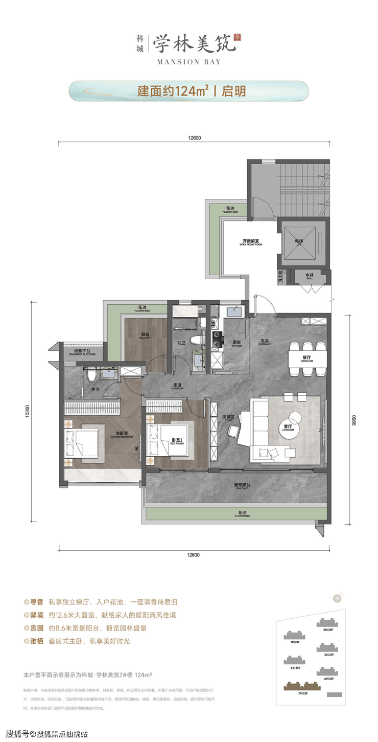 建筑面积约124/143/179㎡三大奢适平层户型,以满配精装交付规格,营造崖州湾塔尖生活主场;空间设计上,采用客厅、餐厅、厨房、阳台一体化贯通的LDKBG先进设计理念,在提升空间利用率和室内通透度的同时,更注重花园式阳台的打造与利用,更契合热带海岛生活特点,让阖家欢享的美时美刻,绽放最灿烂的欢乐与阳光。