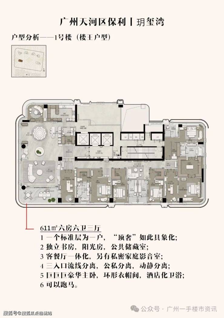 项目1号楼611㎡楼王户型套均售价约一个亿起步,楼王户型均价在18万左右/㎡,一层一户的设计让每一户都能拥有270°的环幕江景视野,整个1号楼611㎡的楼王产品也仅有30套稀缺单位可售,注定将会颠覆广州顶豪市场非常抢手!