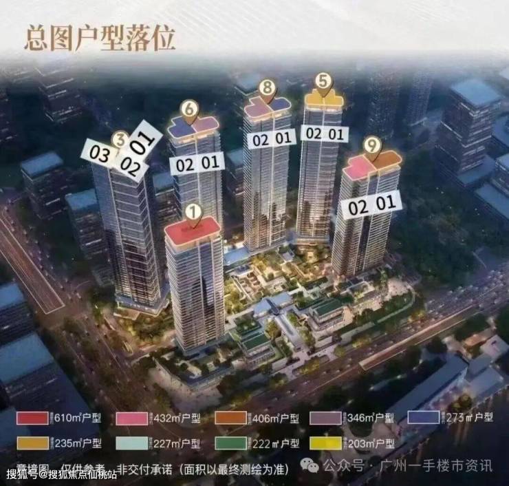 保利玥玺湾项目总共由6栋35-50层高的超高层住宅组成,1号楼是整个项目最大的611㎡一层一户楼王户型,3号楼户型涵盖203-222-227㎡三种四房户型,6号楼和8号楼的户型则是相同镜像的270㎡四房和347㎡五房产品,5号楼户型均为237㎡四房产品,9号楼则是前排大面积的407-432㎡楼王五房户型。