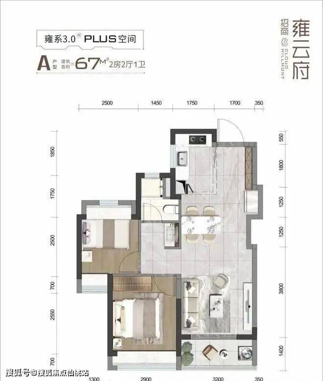 67㎡的2房2厅1卫,设计的是竖厅格局,客餐厅一体化,客厅3.2米开间,S墙设计预留冰箱位,2个卧室分别是2.9/2.5米的宽度,L型厨房,卫生间三段式分离设计,东北朝向。