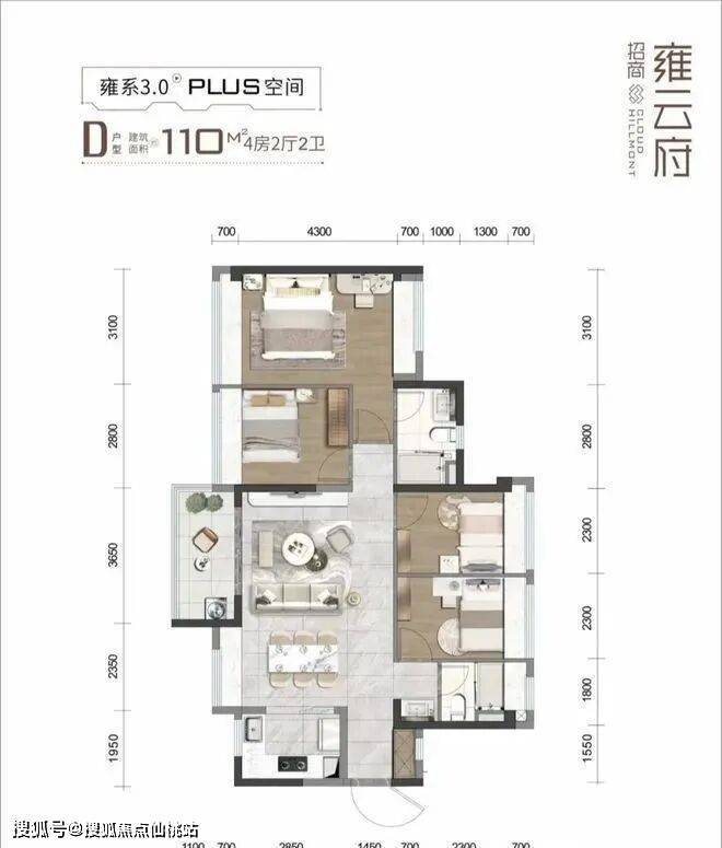 110㎡的4房2厅2卫,设计的是横厅南北通透格局,客餐厅一体化6米开间,4个卧室分别是3.1/2.8/2.3/2.3米的宽度,L型厨房,公卫三段式分离设计,得房率:78.7%(不含赠送),阳台主朝西南向。