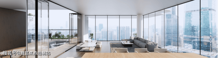 客厅采用270°环幕落地窗设计,给人以广角视野,让家瞬间变得通透高级,闲坐其中,朝朝暮暮,四季美景,举目可得,充分呈现了大平层空间的壮丽震撼