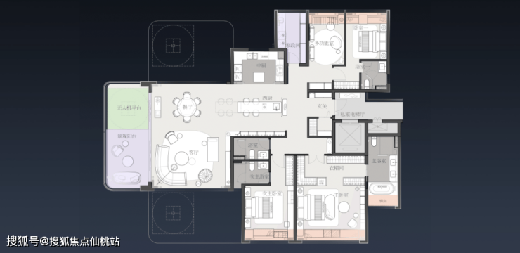 以项目约230㎡的户型产品为例,餐客厅为时下流行的大横厅设计,但以往的横厅户型,会与起居或功能空间放在一起,牺牲掉部分私密性。