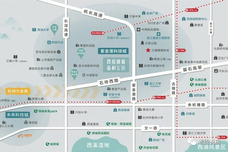 【交通配套】:丰富的地铁资源,可快速到达地铁2号线三墩站、在建的4号线紫金港路站,5号线浙大紫金港站,5号线距项目直线距离约1.5公里,拥有16个换乘站,堪称“换乘之王”。
