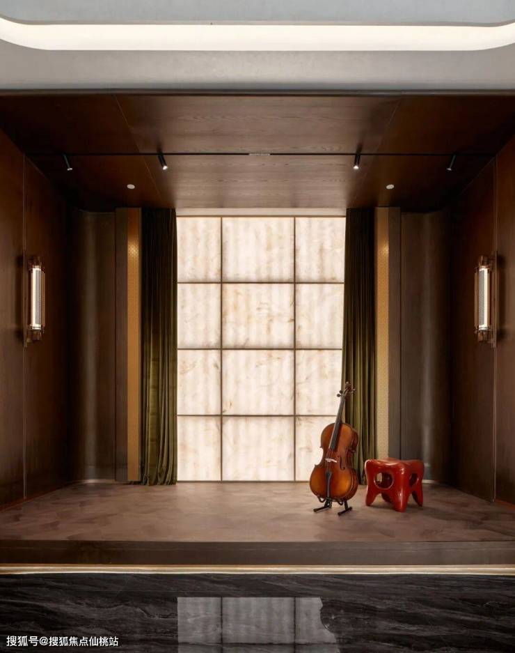 与活力相对的,是2号楼“绿岛艺境”的静谧艺术氛围。空间以独特的“浮岛”高差设计与珍贵的“百达翡翠”石材铺陈,奠定了沉浸式基调。这里更像是家庭的私人艺廊,父母的收藏、孩子的画作都能在此展出,让艺术成为家人之间最亲密的陪伴,在静谧中滋养关于美与成长的日常。