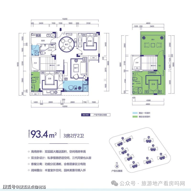 户型3:建筑面积约93.4㎡,3房2厅2卫。该户型周正,动静分区明显;双主卧套房设计,私密性大大加强;双层超大赠送空间,阔绰露台,丰富户外空间。