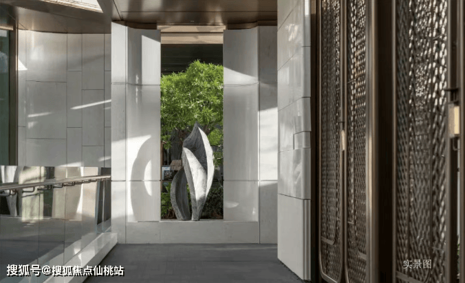 踏入三亚保利天珺主庭,玉的仪式感自门庭启幕——约3.6米高海浪灰石门柱顶悬精致玉石,珺字徽章如玺印烙刻山河气度。