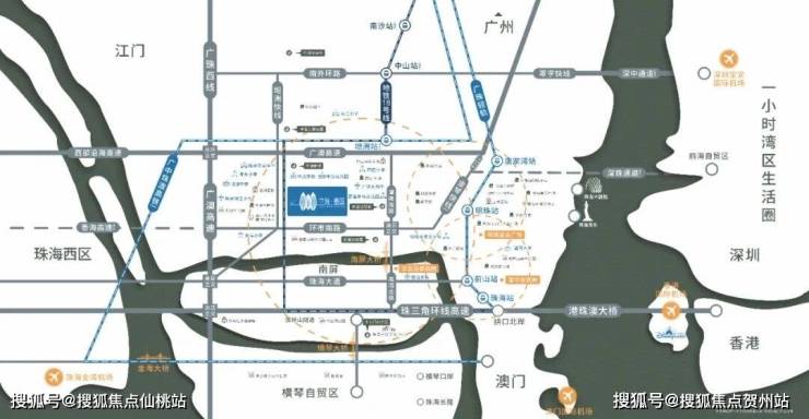 與珠海南灣片區僅一橋之隔,可迅速到達華發商都、珠海明珠站、橫琴、拱北口岸等,同時接軌港澳,盡 享中珠雙城半小時生活圈