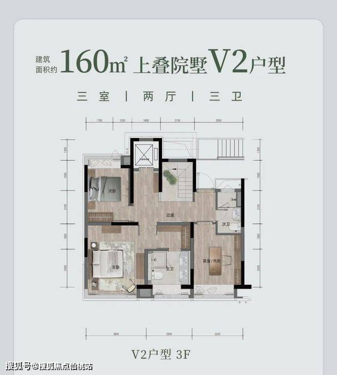 上叠院墅 V2 户型,约 160㎡(或 158.1㎡ ),三室两厅三卫。有私人电梯、双重玄关,约 6.1 米度假观景横厅,270° 三面采光 。约 30㎡L 型花园露台,能欣赏 270° 环幕景观。主卧奢阔,配备步入式衣帽间与独立卫浴,还有可拓展空间随心改造。