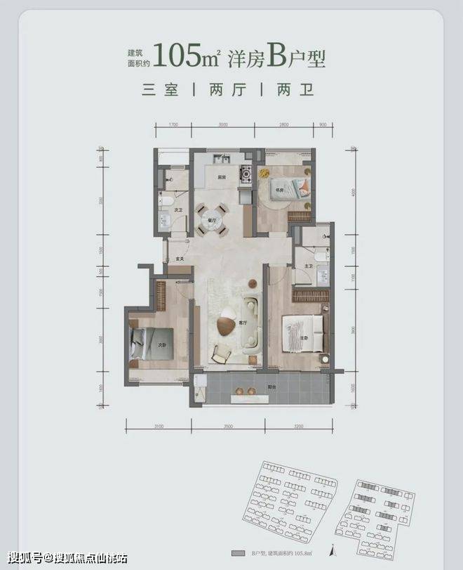 洋房 B 户型,面积约 105㎡(或 105.8㎡ ),同样三室两厅两卫。三开间朝南,南北通透,主卧联通约 6.7 米南向阳台。双厅竖向 LDKB 一体格局,空间利用率高,得房率也高。