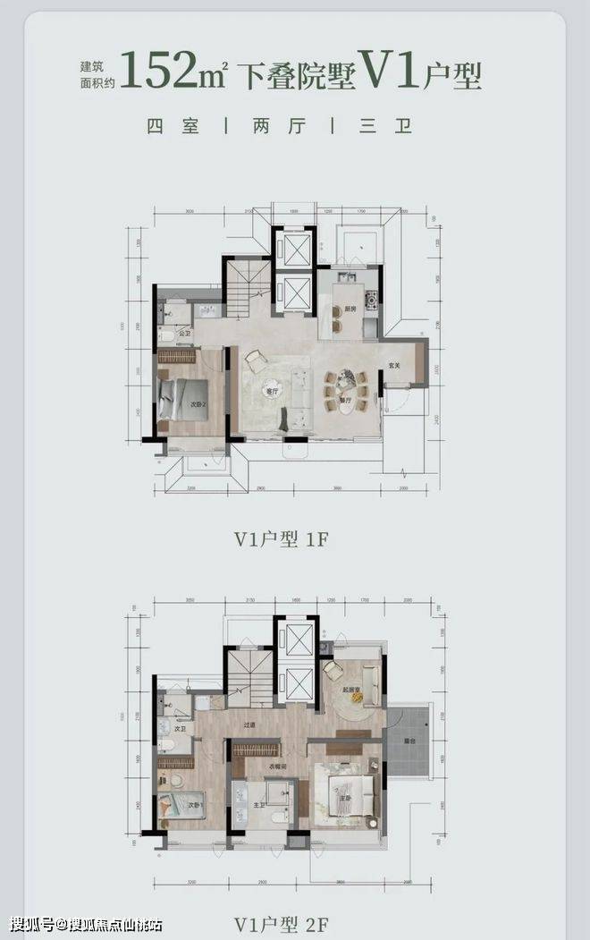 下叠院墅 V1 户型,约 152㎡(或 151.4㎡ ),四室两厅三卫。配备私人电梯、双重玄关入户,从地下车库可直达。约 6.7 米奢阔度假横厅,约 40㎡会客空间 。还有私家花园露台,主卧是酒店行政套房式设计,还有多重可拓展空间。