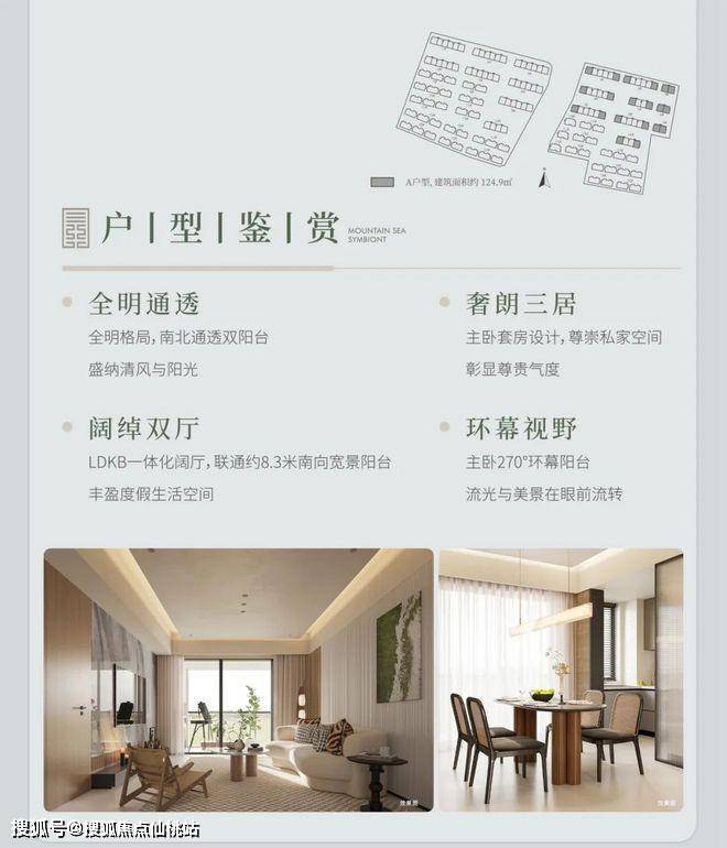洋房 A 户型,建筑面积约 122㎡(或 124.9㎡ ),三室两厅两卫。全明通透,南北通透双阳台,主卧套房设计超有尊崇感。LDKB 一体化阔厅联通约 8.3 米南向宽景阳台,主卧还有 270° 环幕阳台,美景尽收眼底。