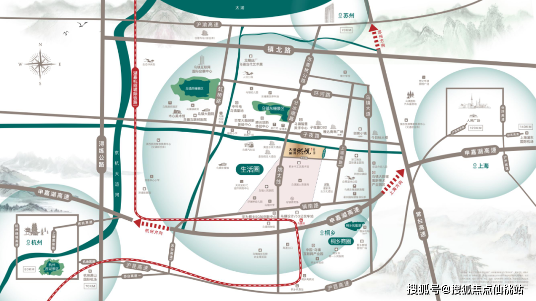 乌镇位于桐乡市北端,地处两省三市交汇处,是长三角经济圈中心区域,西临湖州市,北界江苏吴江县。乌镇距桐乡市区 13 公里,距杭州 60 公里、苏州80 公里,距上海虹桥 110 公里;申嘉湖杭高速、乍嘉苏高速、沪杭甬高速和杭宁高速快速通达上海、杭州、苏州等核心城市,沪杭高铁更实现与上海、杭州无缝对接。高速约 1 小时到达杭州,约 2 小时到达上海,沪杭高铁约 17 分钟直达杭州,约 35 分钟直达上海,融杭接沪纳入两大都市圈。2014年11月19日乌镇成为世界互联网大会永久会址,更是奠定了“世界的乌镇”的地位,很多外地人不一定知道桐乡,甚至嘉兴,但是他们一定都知道乌镇。