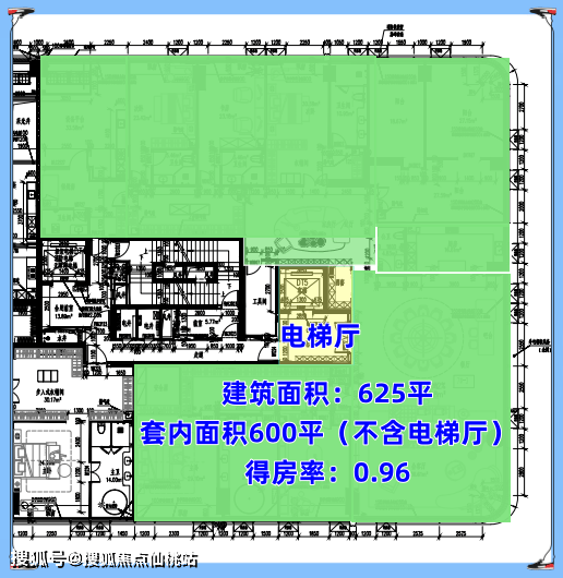 建筑面积:625平,套内600平(不含电梯厅),得房率96%,比之前商业得房率大幅提升!价格当然也会飞涨。