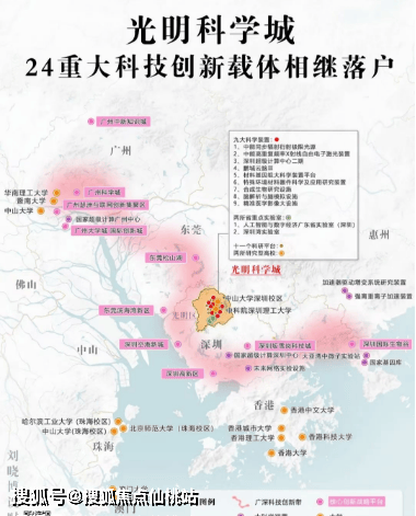 入驻创新载体:24项重大科技创新载体相继落户光明,包括九大科学装置、两所省重点实验室、十一个科研平台;