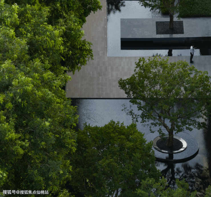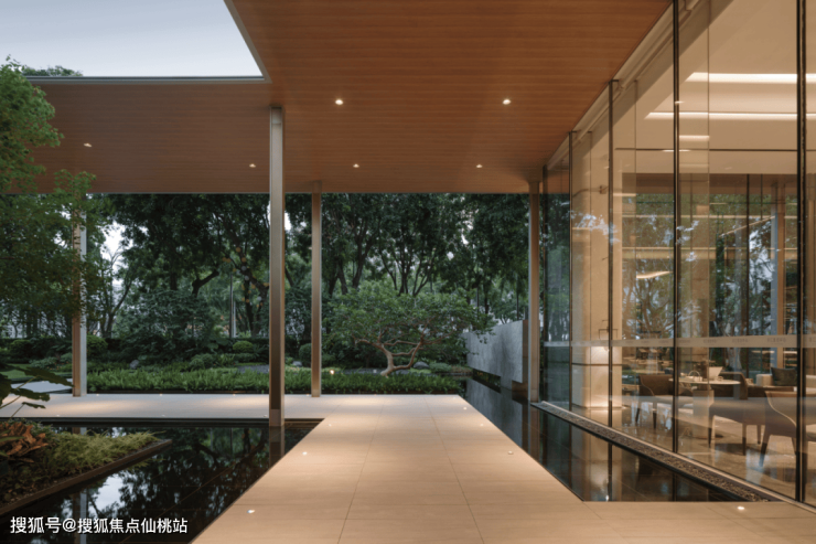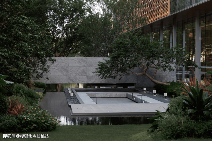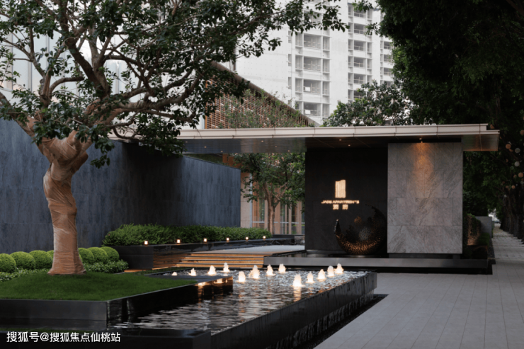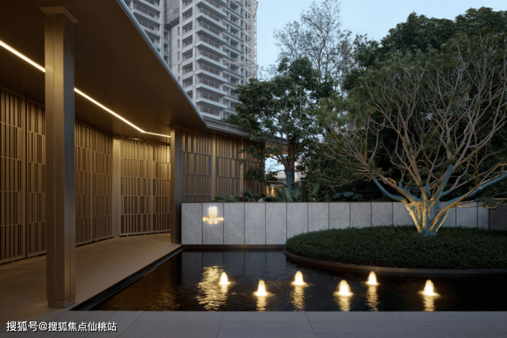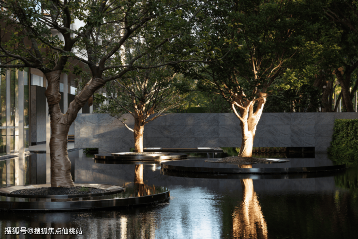 点景树和跌水的巧妙布局构建了一个宁静平和的过渡空间,为步入光影水院埋下情绪的伏笔,让居者置身于一个自然与艺术完美融合的场所。