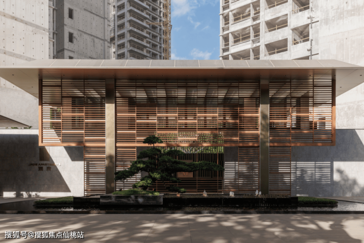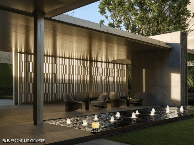 酒店式门廊设计灵感来自于高定度假酒店,阳光透过不同材质构成的格栅,营造令人印象深刻的光影效果,造型树结合入口水景将奢华点缀其中,感受现代别致的意境之美。