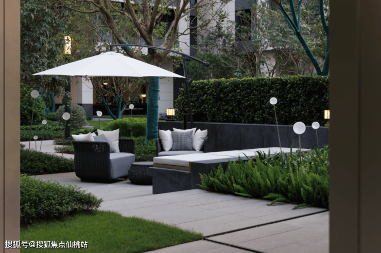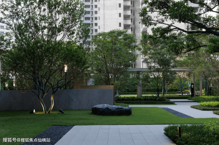 作为架空层对景的造型置石,犹如艺术品般点缀在葱茏之间,造型独特的树木结合景墙丰富了整个景观的层次感,给整个住区增添现代简约的艺术张力。