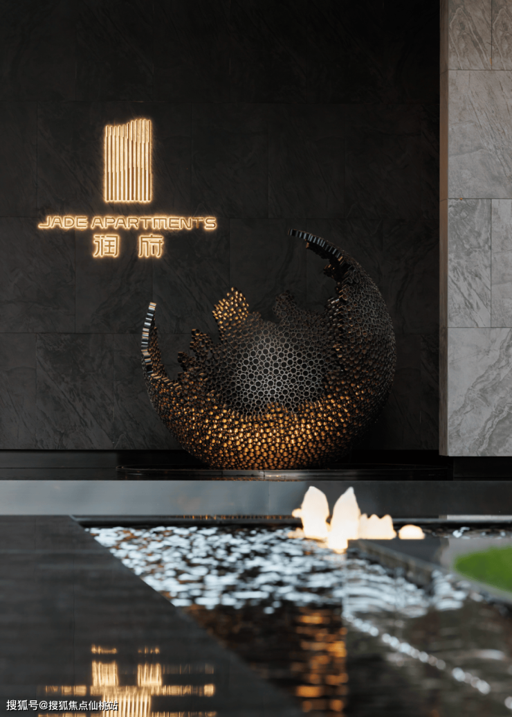 入口艺术雕塑结合简洁水景,通过倒影与灯光打造酒店质感的艺术氛围,营造出独特而令人难忘的迎宾体验,为入口空间增添了高雅的视觉感受。