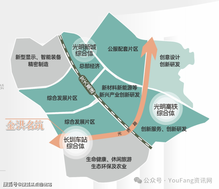 【金洪名筑核心价值点】世界一流科学城,凤凰城核心区,立享精粹醇熟配套光明科学城,中国版“硅谷”、大湾区科技创新“主引擎”。凤凰城片区,将打造成光明中央商务区、总部经济聚集区、超级商圈所在地。金洪名筑占据凤凰城“一环两轴三核”发展格局中的“一轴一核”(光侨路——创新产业发展轴;轨道长圳站节点——光明门户之核芯)。周边云集金洪大厦、招商智慧城、TCL华星光电等十余个科技产业园区,释放磅礴产业红利。