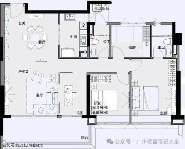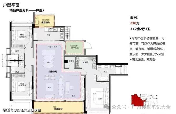 约120㎡三房两厅两卫,约4米客厅、餐厅开间,宽绰生活功能区格局,满足三代人居需求百变的收纳空间,多变创意空间,入户花园/影音室/琴房/书房等灵活满足家庭需求。
