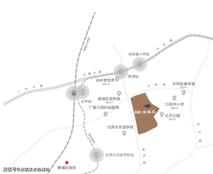 直线距离约800米地铁21号线长平站,1站黄埔区府(水西站)、2站万达广场(苏元站)、5站到天河(天河智慧城站);步行约400米有轨电车1号线羌洞站,1站换乘21号线。