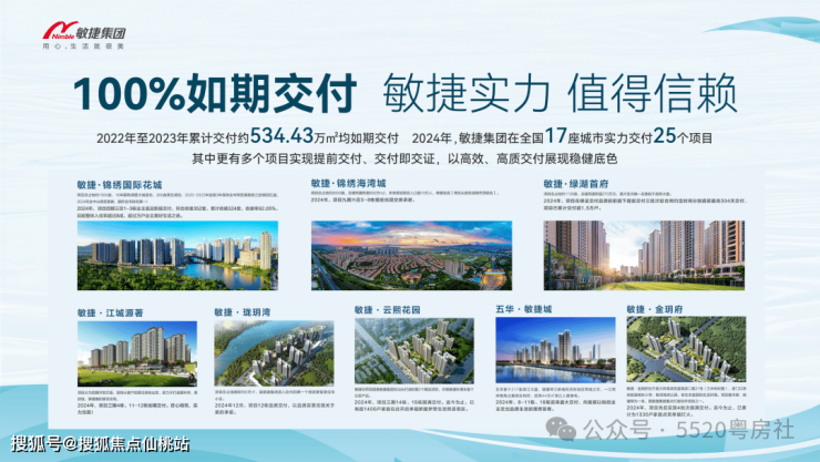 交付累计超120个项目,约3000万㎡,保驾护航累计约60万业主收楼,2022年至2023年累计交付约534.43万㎡,均如期交付,锦绣国际花城2012年3月5日首期交付,截至2023年5月累计交付面积约175万㎡,共交付12617户。