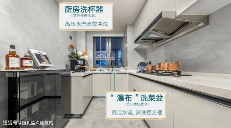 厨房配备 “瀑布”洗菜盆和洗杯器,花样的清洗和高压水流,让清洗蔬果和杯子时更加得心应手。