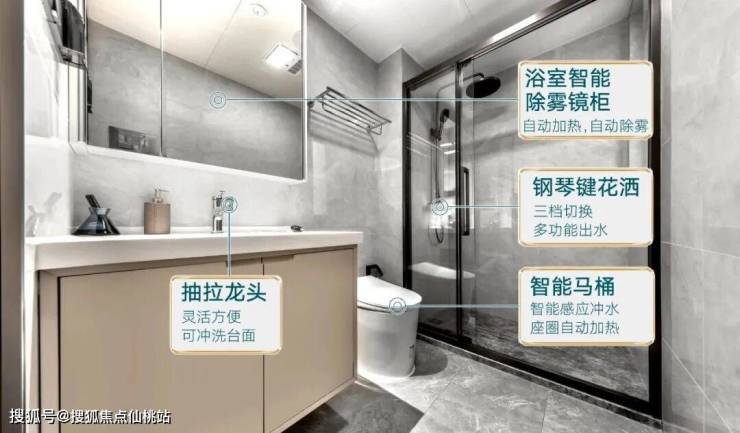 浴室 钢琴键花洒、智能除雾镜 柜相辅相成,舒心沐浴后,镜面自动除雾,方便睡前洁面护养; 抽拉龙头适用多种场景,无论是出门时赶着洗头,还是日常清洗台面都更得心应手; 智能马桶自动加热座圈、感应冲水,即使阴冷天气也能舒适由心。