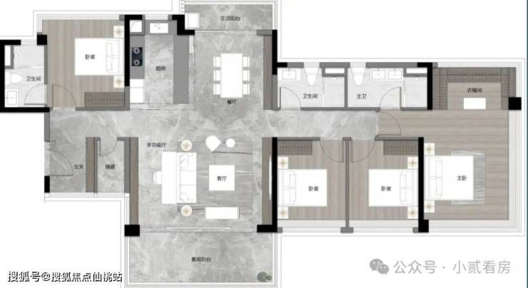 建面约123平四房,卧室都可放下1.8米大床,体验感相当于144平大宅,品质感更高。