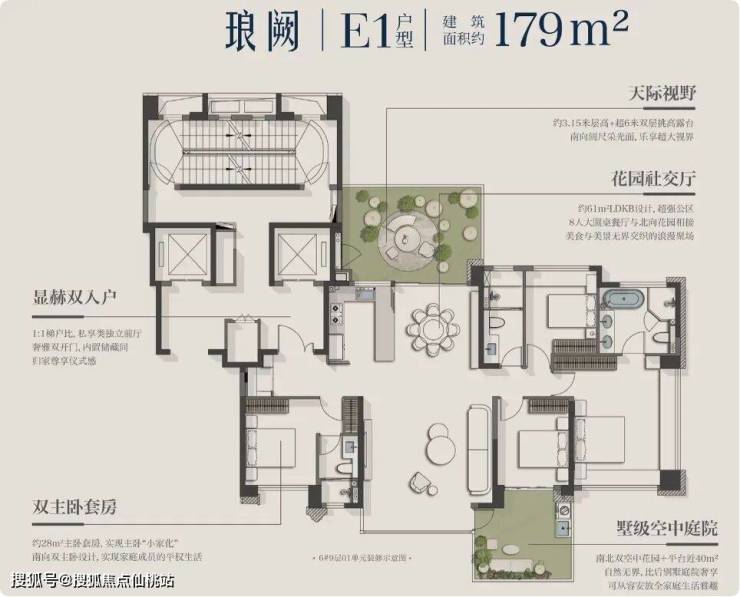 6号楼的179㎡户型,是五缘湾首个湾海四代宅,3.15米的层高,再加上两个近40平的超大空中庭院,真正实现了“别墅瞰大海”的理想生活,综合使用率接近100%;