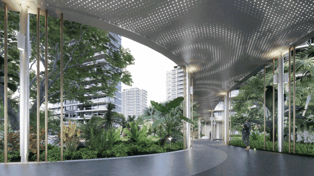入口进来,便是“仪式绿洲”,这里设计了入口水景和门楼,再通过风雨连廊串联至泛会所,通过双重归家礼序,注解千万级的身份感。