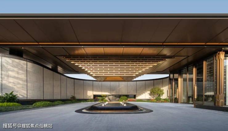 大门主入口引入“把酒店搬回家”的产品理念和“回家即度假”的生活理念,打造奢华酒店式归家大门。屋顶高约9.7米,整体挑檐向两侧延伸,长约49米,庑殿金顶的屋顶形态,以现代化的设计手法融入传统屋顶形式,结合鲁班锁倒影装置传达山水倒影的意境生活。