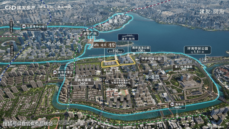 撷取湾海生活灵感,洞察岛居理想,建发·阅海循世界湾区蓝图,立于厦门乐活岛中轴北岸一线瞰海景观位。直线距离一公里范围内,医养、轨道、商业、学校、公园资源集萃:约380米综合性三甲长庚医院,约590米地铁新阳大道站,约360米招商花园城,约450米双十海附庚西学校,约100米南岸滨海公园,成就海洋与人居交织的诗意生活理想。
