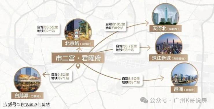 君曜府楼下就是市二宫商圈,新市二宫设有网球场、游泳馆、电影院等,满足文化教育、娱乐休闲等多重需求;1公里范围内万国广场、江南西、海珠广场、北京路等5大知名商圈覆盖,构筑都荟新潮生活聚场。