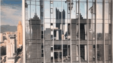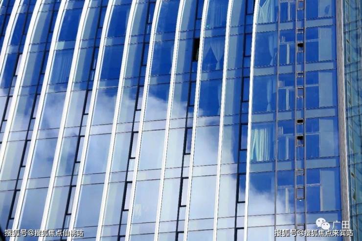 ▲幕墙装饰条间隔清晰、均匀,玻璃幕墙透光度佳,云朵折射清晰可见