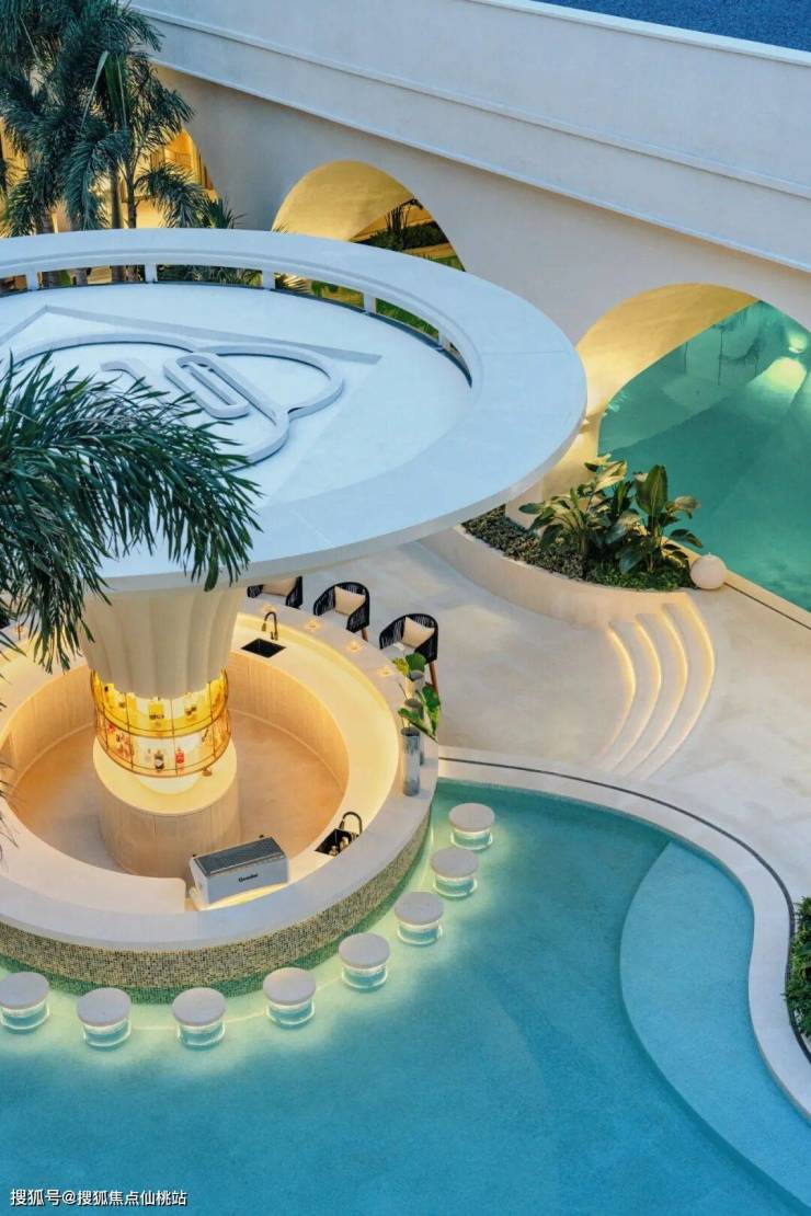 建筑外立面,以浅色色调+通透的玻璃幕墙,勾勒出流动曲线轮廓,满眼精奢度假的视觉语言。