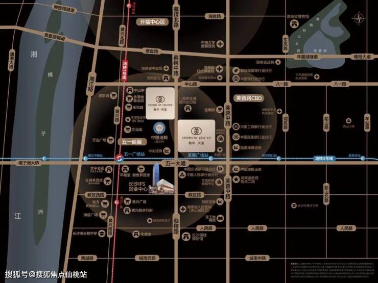 四、交通出行:双地铁+城市主轴,全维度高效通勤地铁出行:距地铁2号线芙蓉广场站约200米,距1/2号线五一广场换乘站约600米,双地铁便捷直达长沙火车站、高铁南站、黄花机场。